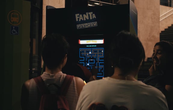 ação OOH com arcade de Pacman em frente à Casper Líbero